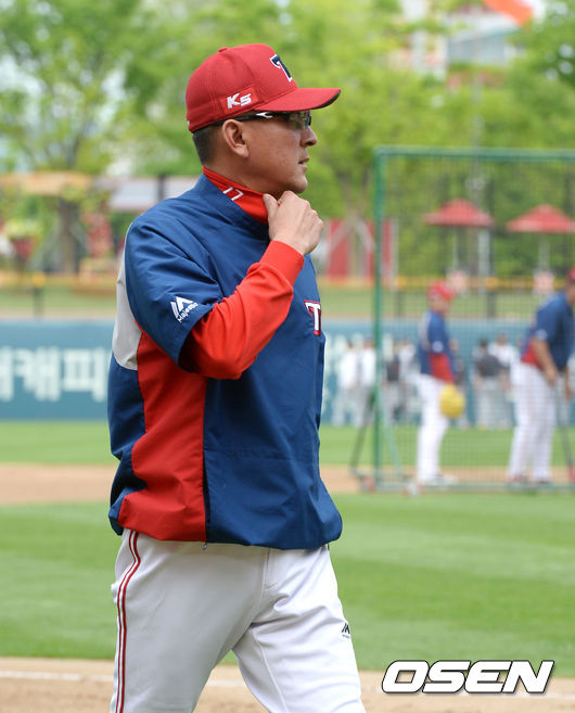 경기에 앞서 KIA 김기태 감독이 훈련을 지켜보고 있다.