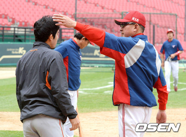 경기에 앞서 KIA 김기태 감독과 한화 이용규가 인사를 나누고 있다.