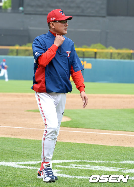 경기에 앞서 KIA 김기태 감독이훈련을 지켜보고 있다.