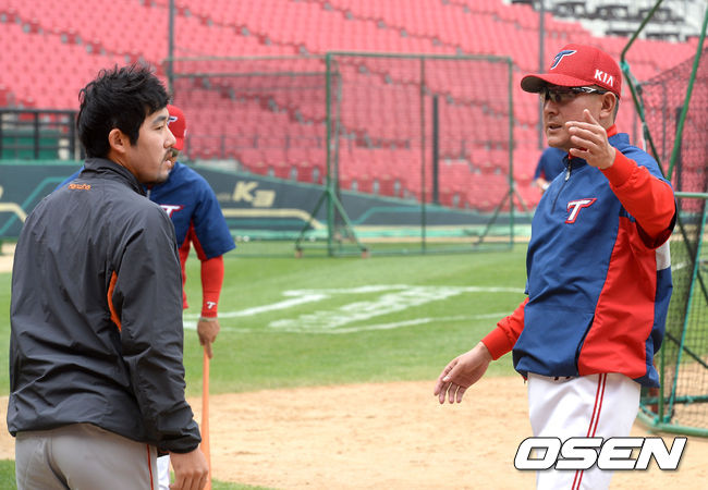 경기에 앞서 KIA 김기태 감독과 한화 이용규가 인사를 나누고 있다.