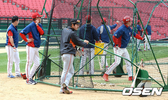 경기에 앞서 한화 이용규가 KIA 김기태 감독과 타격 훈련을 지켜보고 있다.