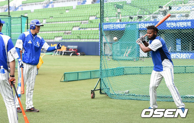 30일 오후 대구 시민운동장야구장에서 열릴 '2015 타이어뱅크 KBO 리그' 삼성과 LG의 경기에 앞서 삼성 이승엽이 나바로에게 배팅볼을 던져주고 있다.