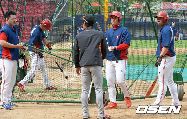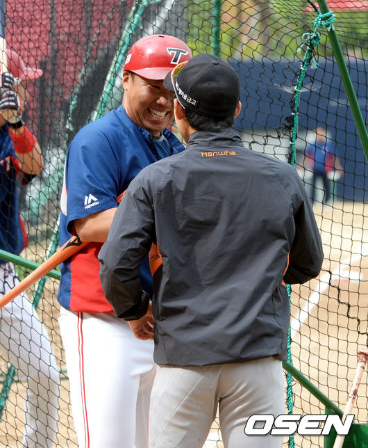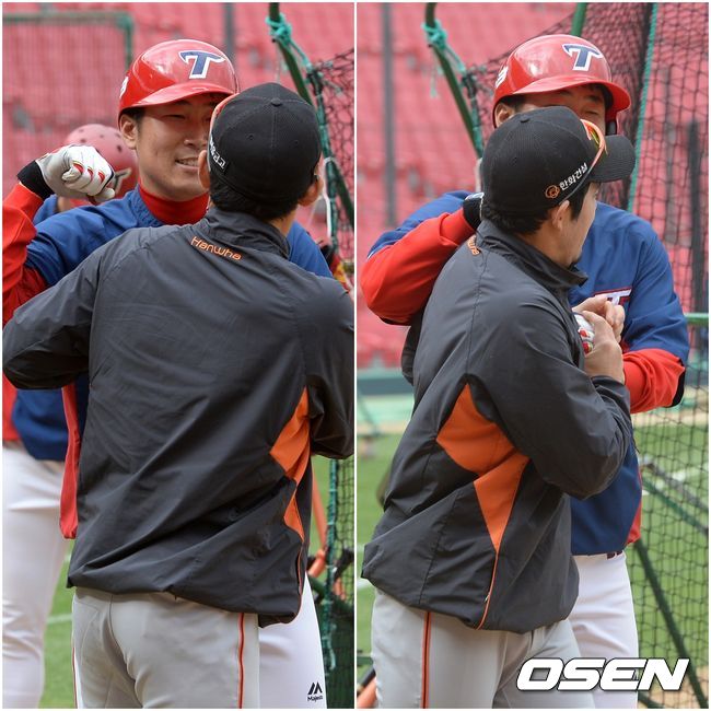경기에 앞서 KIA 이성우, 이범호가 한화 이용규와 전날 험버의 사구에 대해 이야기를 나누고 있다.