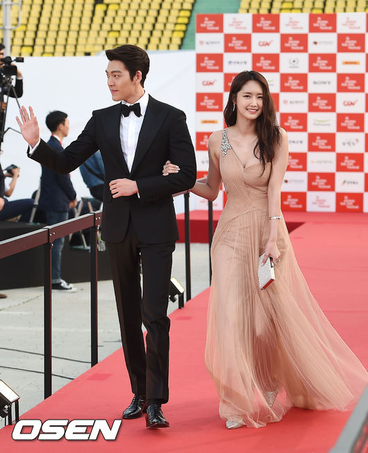 김우빈과 정주연이 레드카펫을 밟고 있다.