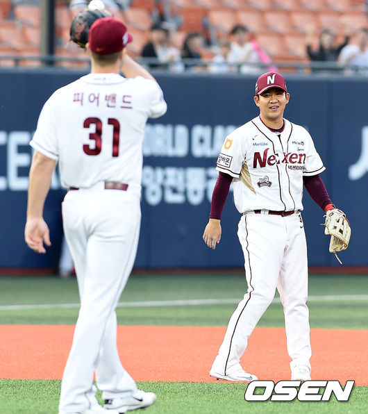 30일 오후 서울 목동구장에서 열린 '2015 타이어뱅크 KBO 리그' 넥센 히어로즈와 롯데 자이언츠의 경기 2회초 1사 강민호의 땅볼을 잡아 1루로 송구 아웃처리한 김민성이 피어밴드를 보며 미소를 짓고 있다.