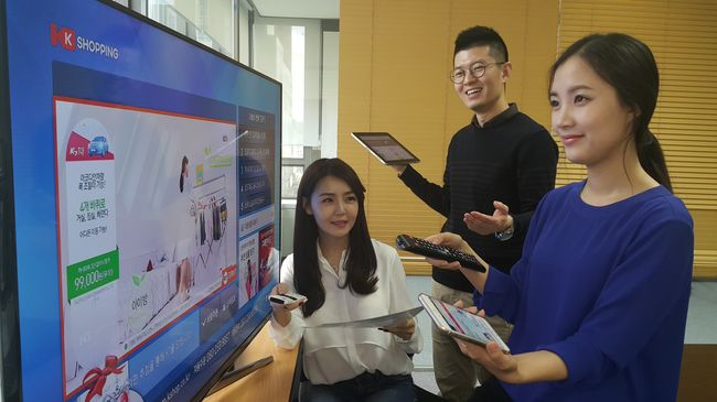KTH가 CJ헬로비전 25번 채널에 디지털홈쇼핑(T커머스) K쇼핑을 5월 1일 런칭한다. 사진은 직원들이 TV와 스마트패드, 스마트폰을 통해 K쇼핑 서비스 시연을 하고 있는 모습. / KTH 제공