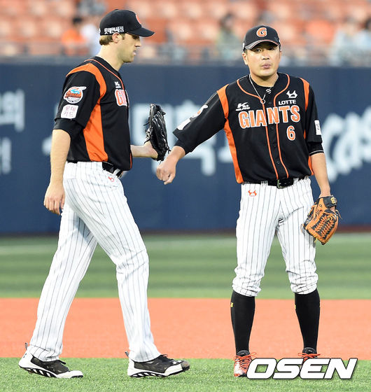 30일 오후 서울 목동구장에서 열린 '2015 타이어뱅크 KBO 리그' 넥센 히어로즈와 롯데 자이언츠의 경기 2회말 1사 윤석민의 땅볼을 문규현이 잡아 아웃 처리하고 린드블럼과 하이파이브를 하고 있다.