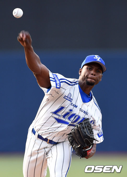 1회초 무사에서 삼성 선발투수 피가로가 힘차게 공을 던지고 있다.