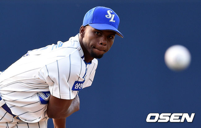 1회초 무사에서 삼성 선발투수 피가로가 힘차게 공을 던지고 있다.