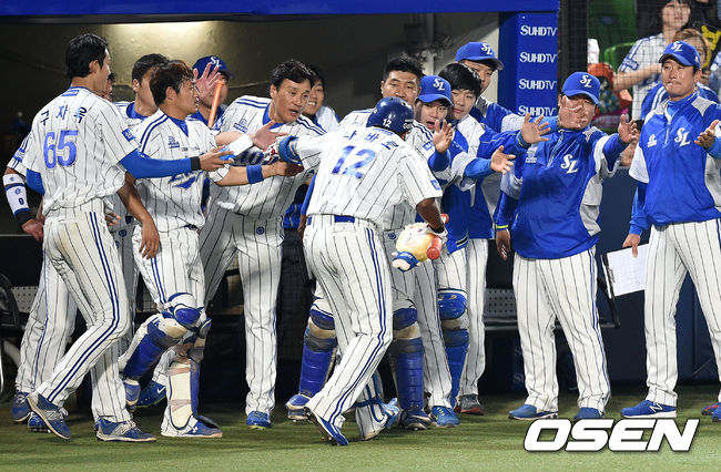 3회말 1사에서 삼성 나바로가 좌중월 솔로 홈런을 치고 더그아웃에서 동료들의 축하를 받고 있다.