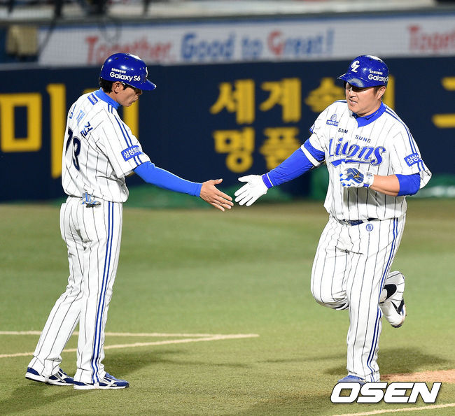 3회말 1사에서 삼성 최형우가 우중월 솔로 홈런을 치고 김재걸 코치와 하이파이브를 하고 있다.