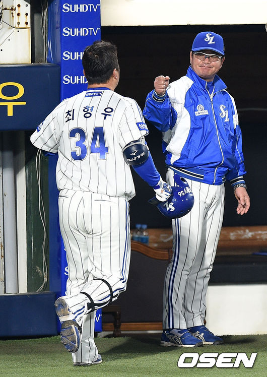 3회말 1사에서 삼성 최형우가 우중월 솔로 홈런을 치고 더그아웃에서 류중일 감독과 하이파이브를 하고 있다.