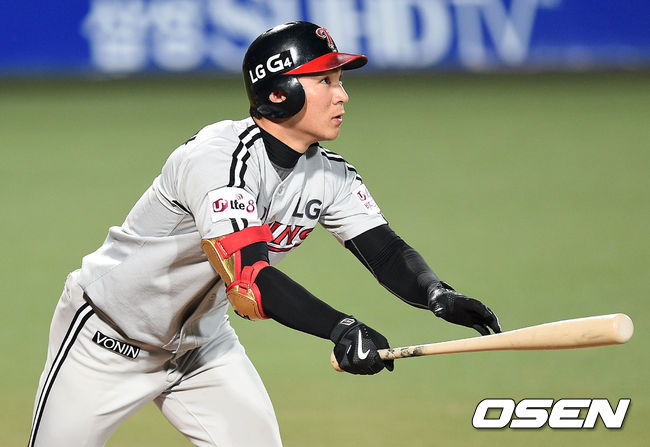 5회초 무사 1루에서 LG 오지환이 우월 투런 홈런을 치고 있다.