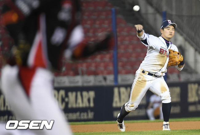 30일 오후 서울 잠실야구장에서 열린 '2015 타이어뱅크 KBO 리그' 두산 베어스와 kt 위즈의 경기, 6회초 무사 주자 1루 두산 최주환이 kt 김상현의 3루수 앞 땅볼을 처리하고 있다.