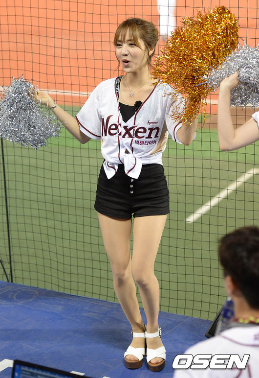 30일 오후 서울 목동구장에서 열린 '2015 타이어뱅크 KBO 리그' 넥센 히어로즈와 롯데 자이언츠의 경기, 정순주 아나운서가 공연을 펼치고 있다.