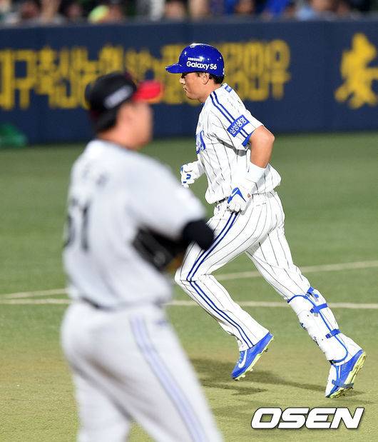 5회말 2사에서 삼성 이승엽이 우월 솔로 홈런을 치고 그라운드를 달리고 있다.