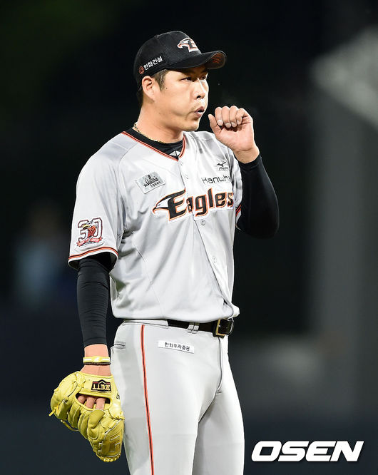 8회말 한화 권혁이 마운드에 올라 투구를 준비하고 있다.
