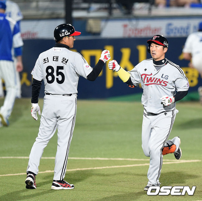 8회초 무사 1루에서 LG 이병규가 중월 투런 홈런을 치고 최태원 코치와 하이파이브를 하고 있다.