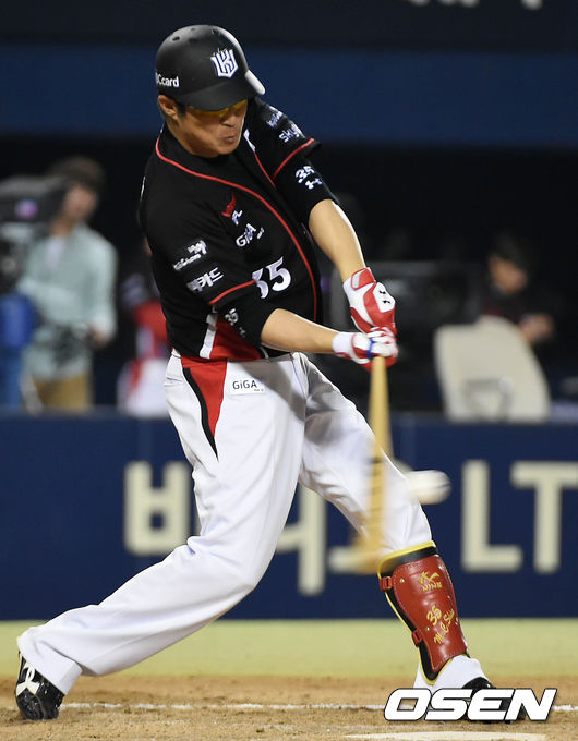 30일 오후 서울 잠실야구장에서 열린 '2015 타이어뱅크 KBO 리그' 두산 베어스와 kt 위즈의 경기, 9회초 2사 주자 3루 kt 신명철이 동점 적시타를 치고 있다.