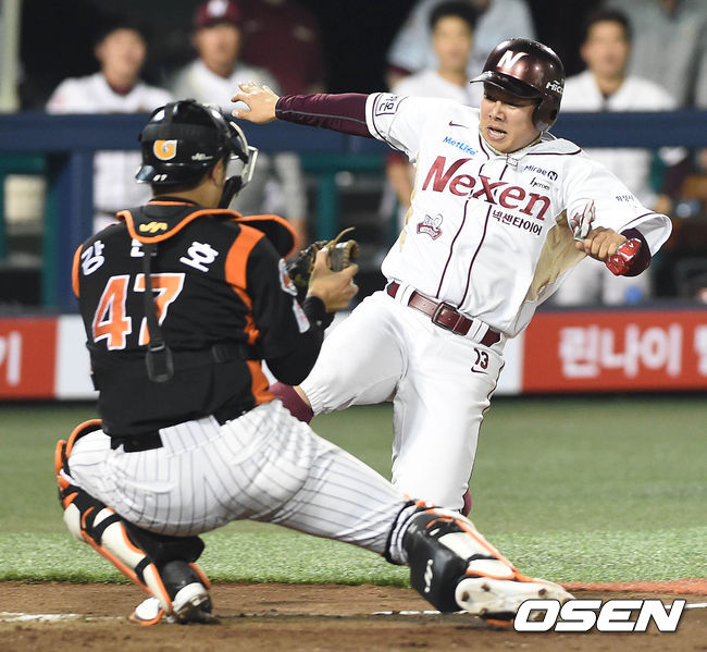 30일 오후 서울 목동구장에서 열린 '2015 타이어뱅크 KBO 리그' 넥센 히어로즈와 롯데 자이언츠의 경기 8회말 2사 2루 김하성의 중전안타에 홈까지 쇄도하던 2루주자 윤석민이 홈에서 아웃 당하고 있다.