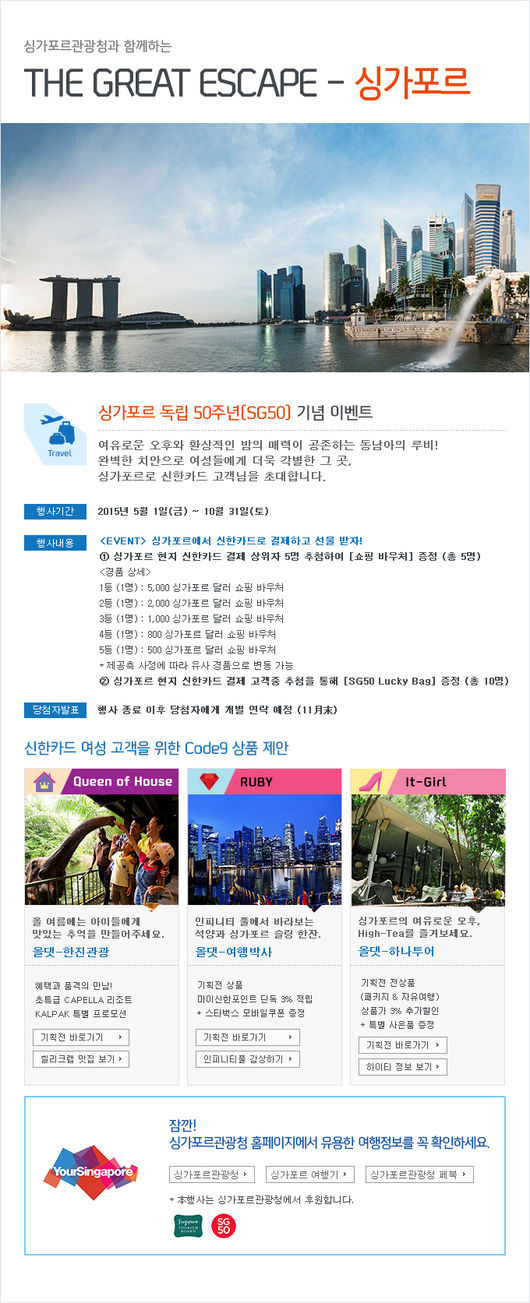 싱가포르관광청은 싱가포르 독립 50주년을 기념해 신한카드와 함께 오는 5월 1일부터 10월 31일까지 싱가포르를 다녀온 여행객을 대상으로 800만 원 상당의 쇼핑 바우처와 럭키백을 증정하는 축하 이벤트를 진행한다.