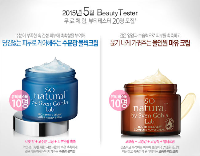수분이 부족한 속건성 피부를 오랜시간 당김없이 촉촉한 피부로 가꿔주는 하이 워터 슈퍼 하이드라 밤과 마유오일이 건조하고 푸석이는 피부에 보습력과 영양을 공급해주는 유스 리커버리 컴포트 마유 크림을 만나 볼 수 있는 5월 뷰티 테스터는 쏘내추럴 홈페이지(www.sonatural.co.kr)의 이벤트 페이지에서 응모할 수 있다.