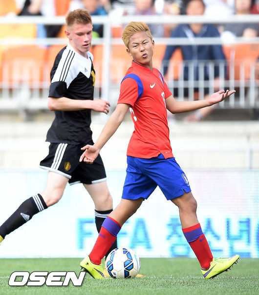1일 오후 경기도 수원시 수원월드컵경기장에서 열린 '2015 수원 JS컵 U-18 국제청소년축구대회' 한국과 벨기에의 경기, 전반 이승우가 오프사이드 판정에 아쉬워하고 있다.