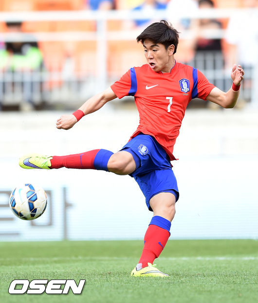 1일 오후 경기도 수원시 수원월드컵경기장에서 열린 '2015 수원 JS컵 U-18 국제청소년축구대회' 한국과 벨기에의 경기, 전반 김대원이 슛을 시도하고 있다.