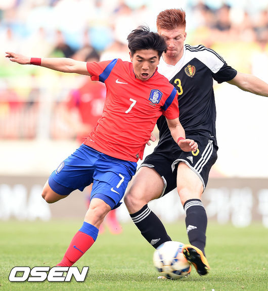 1일 오후 경기도 수원시 수원월드컵경기장에서 열린 '2015 수원 JS컵 U-18 국제청소년축구대회' 한국과 벨기에의 경기, 전반 김대원이 볼을 빼앗기고 있다.