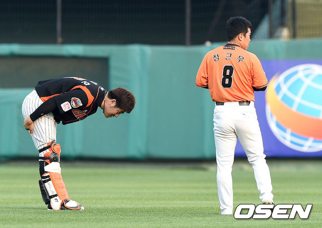 1일 오후 대전 한화생명이글스파크에서 열릴 '2015 타이어뱅크 KBO 리그' 한화와 롯데의 경기에 앞서 롯데 강민호가 한화 선수들과 인사를 나누고 있다.