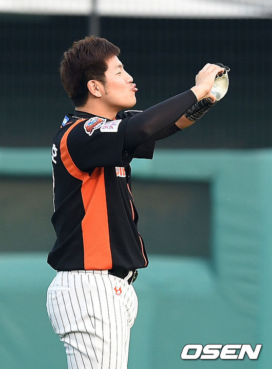 1일 오후 대전 한화생명이글스파크에서 열릴 '2015 타이어뱅크 KBO 리그' 한화와 롯데의 경기에 앞서 롯데 강민호가 한화 선수단을 향해 하트를 그리고 있다.