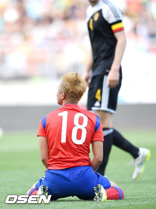 1일 오후 경기도 수원시 수원월드컵경기장에서 열린 '2015 수원 JS컵 U-18 국제청소년축구대회' 한국과 벨기에의 경기, 전반 이승우가 골찬스를 놓친 후 아쉬워하고 있다.