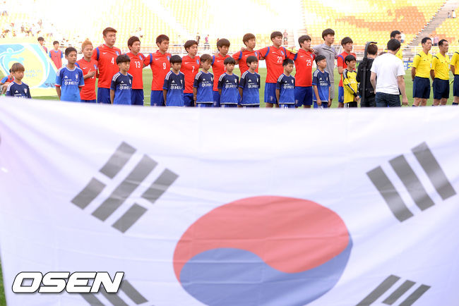 1일 오후 경기도 수원시 수원월드컵경기장에서 열린 '2015 수원 JS컵 U-18 국제청소년축구대회' 한국과 벨기에의 경기에 앞서 한국대표팀이 국민의례를 하고 있다.