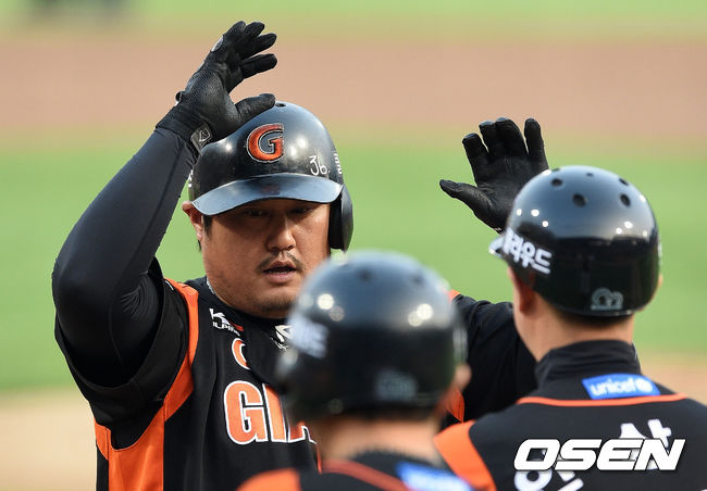 1회초 2사 3루에서 롯데 최준석이 좌월 투런홈런을 치고 환호하고 있다.