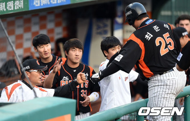 1회초 2사 3루에서 롯데 최준석이 좌월 투런홈런을 치고 더그아웃에서 이종운 감독과 하이파이브를 하고 있다.
