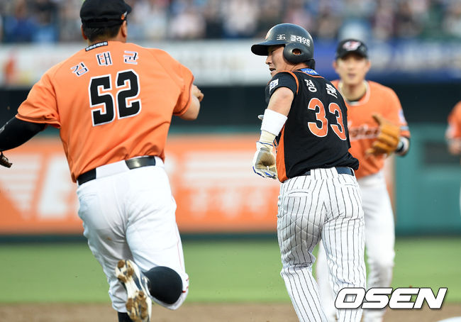 2회말 무사 1루 롯데 김민하의 땅볼때 협살에 걸린 1루주자 정훈이 태그를 피하고 있다.