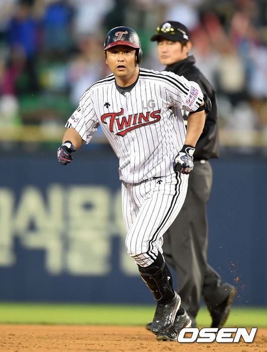 3회말 무사에서 LG 최경철이 솔로포를 날리고 2루에서 멈칫하며 홈런을 확인하고 있다.