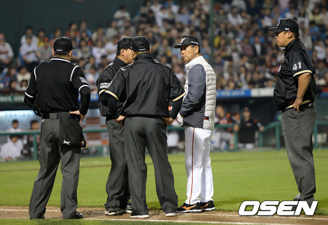4회초 무사 2,3루에서 롯데 문규현의 희생번트때 한화 김성근 감독이 심판진에 수비방해가 아니었냐는 어필을 하고 있다.