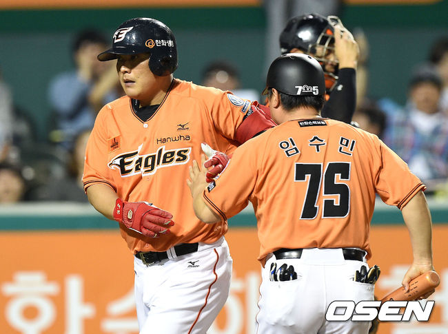 4회초 무사에서 한화 김태균이 좌월 솔로 홈런을 치고 홈에서 임수민 코치와 하이파이브를 하고 있다.