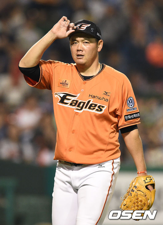 4회초 공수교대때 한화 송창식이 모자를 고쳐쓰며 더그아웃으로 향하고 있다.