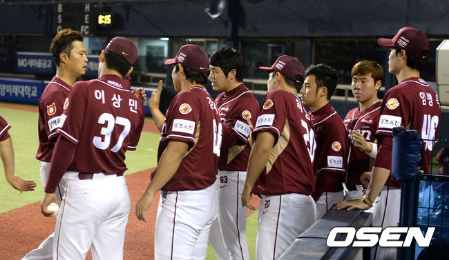 5회말 수비를 마친 넥센 송신영이 더그아웃으로 향하며 동료선수들과 하이파이브를 하고 있다.