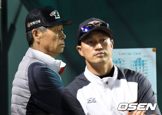 5회말 한화 김성근 감독과 김재현 코치가 경기를 바라보고 있다.