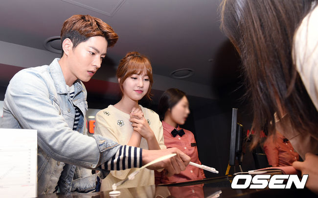 1일 오후 서울 롯데시네마 홍대입구점에서 열린 영화 '위험한 상견례2' 드리미 이벤트에서 배우 홍종현과 진세연이 자리를 고르고 있다.