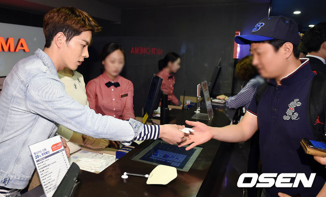1일 오후 서울 롯데시네마 홍대입구점에서 열린 영화 '위험한 상견례2' 드리미 이벤트에서 배우 홍종현이 극장을 찾은 관객에게 선물을 증정하고있다.