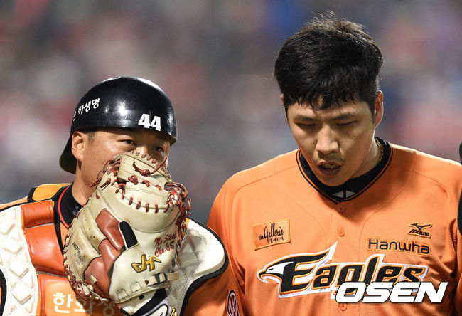 8회초 공수교대때 한화 권혁과 조인성이 더그아웃으로 가고 있다.