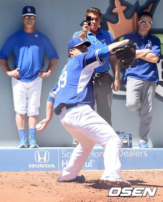 2일(이하 한국시간) 미국 캘리포니아주 로스앤젤레스 다저스타디움에서 열리는 '2015 메이저리그' LA 다저스와 애리조나 다이아몬드백스와의 경기를 앞두고, 다저스 투수 류현진이 돈 매팅리 감독과 릭 허니컷 투수코치 등 팀 관계자들 앞에서 어깨 부상 뒤 세 번째 불펜피칭을 진행했다.