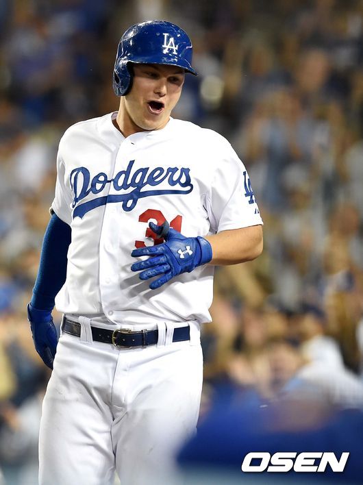2회말 다저스 공격 1사 만루 상황 작 피더슨이 중월 그랜드 슬램을 터트리고 홈을 밟은 뒤 동료들과 환호하며 기뻐하고 있다.