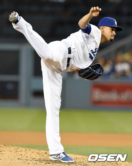 3회초 애리조나 공격 때 다저스 선발 카를로스 프리아스가 힘차게 공을 뿌리고 있다.
