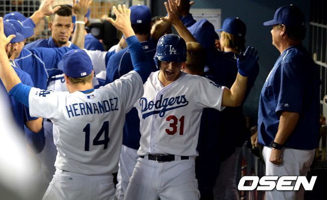 2회말 다저스 공격 1사 만루 상황 작 피더슨이 중월 그랜드 슬램을 터트리고 더그아웃 동료들과 환호하고 있다.