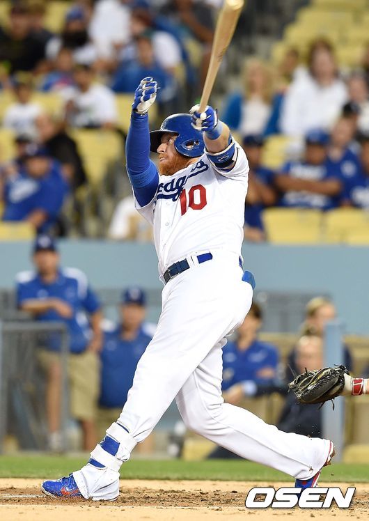 2회말 다저스 공격 선두타자로 나선 저스틴 터너가 중월 솔로포를 날리고 있다.